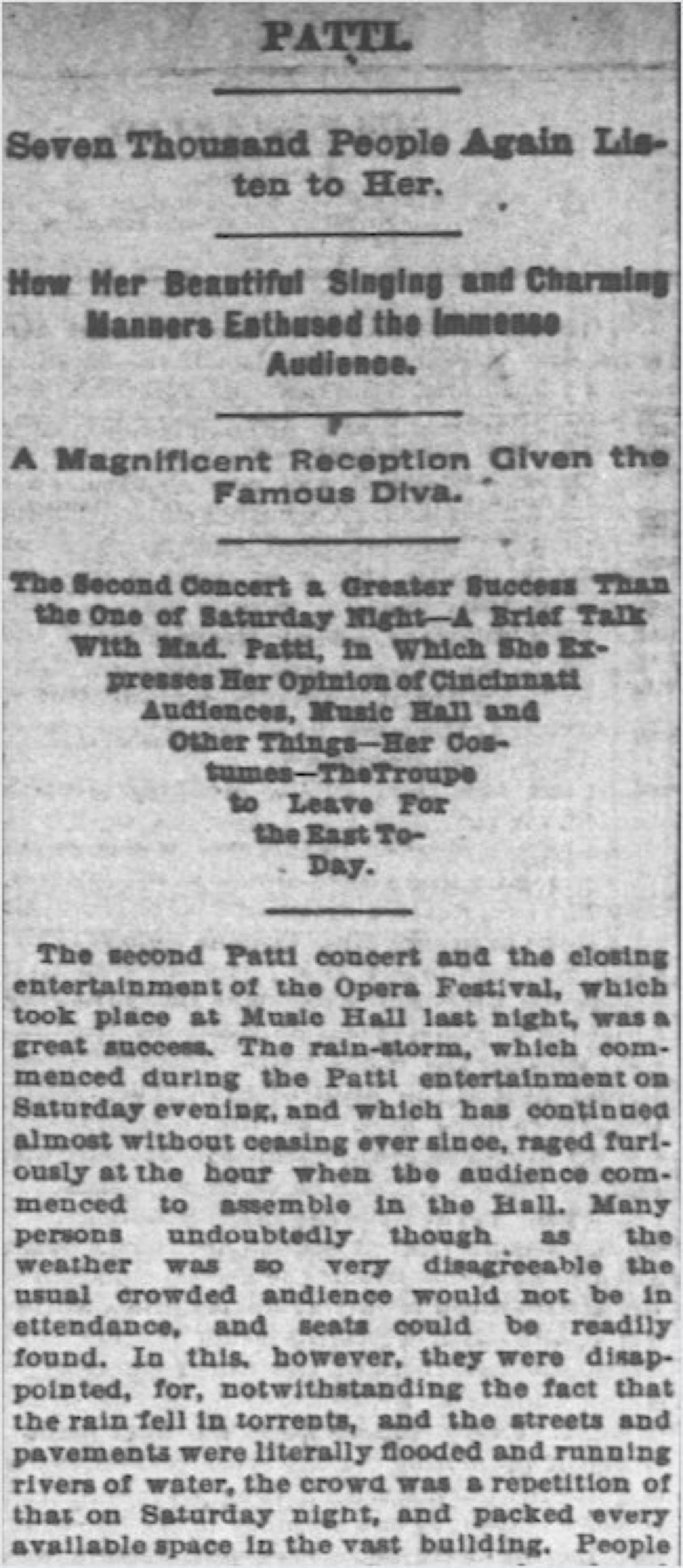 The concert that Wilde attended was a closing entertainment of selected arias by leading singers from the previous week's Cincinnati Opera Festival. Madame Patti chose "Bel Raggio" from Semiramide by Rossini.