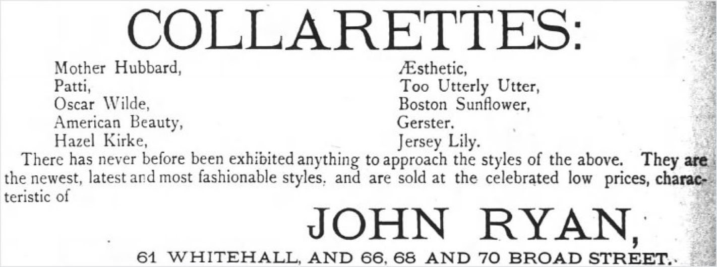 As an indication of the publicity engendered by Oscar Wilde in 1882, here we see fashion designs named for Wilde's friends Adelina Patti and Lillie Langtry, plus at least four inspired by Wilde himself. Others include the Hazel Kirke, which is the name of a play written by Wilde's friend and associate Steel Mackaye. Gerster would be Madame Etelka Gerster-Cardini the Hungarian prima donna.Â